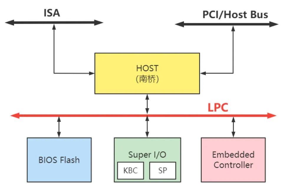 LPC全称LowPinCountBus,即精简引脚总线,由Intel在1998年引入PC产品,相较于ISA总线,LPC 引脚少,速度快。LPC总线用于低速设备(BIOS Flash,Super I/O,TPM)和主板上南桥的连接。