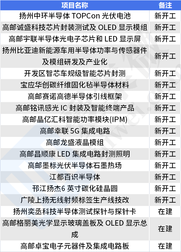 新开工项目中,包括扬州中环半导体 TOPCon 光伏电池项目、扬州比亚迪新能源车用半导体功率与传感器件及模组研发及产业化项目、邗江扬杰6 英寸碳化硅晶圆项目、江都百识半导体项目等。
