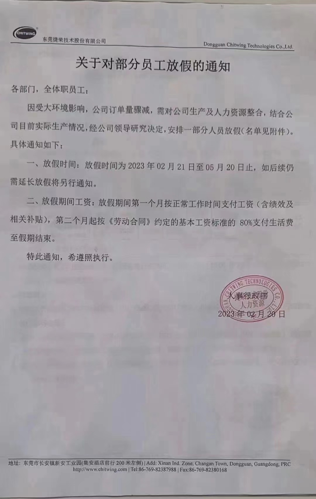 捷荣技术在通知中称,因受大环境影响,公司订单量骤减,需对公司生产及人力资源整合,结合公司目前实际生产情况,经公司领导研究决定,安排一部分人员放假。