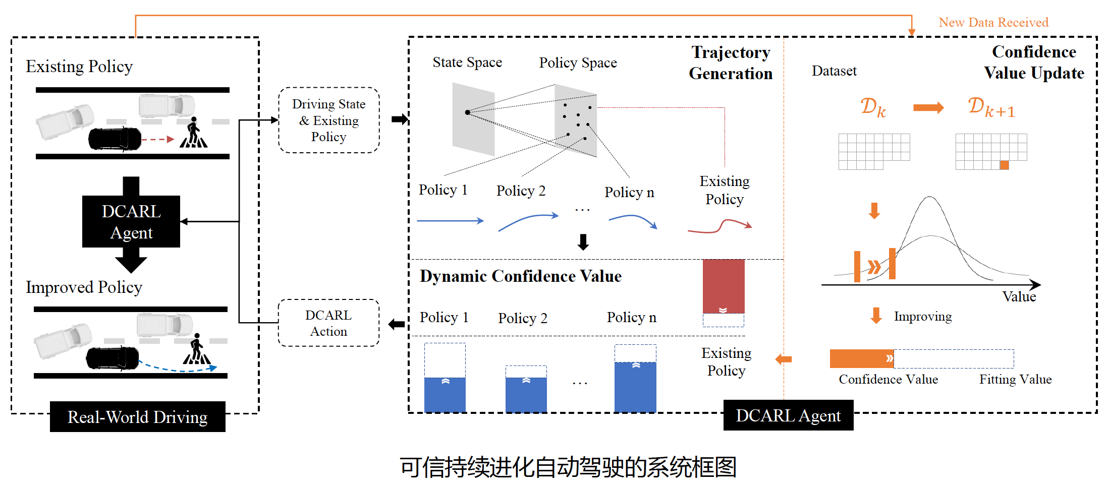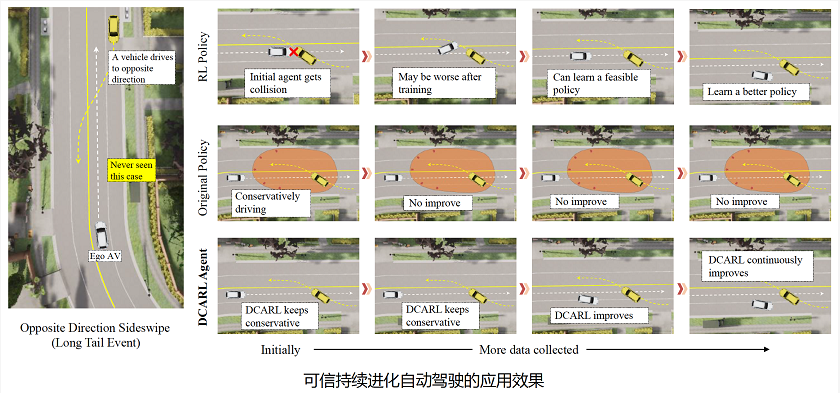 为解决这一问题,清华大学车辆学院研究团队提出了自动驾驶“可信持续进化”技术,该技术会在自动驾驶汽车行驶初期将所有场景无差别地看成未知场景,均采取主动避让的基础驾驶策略以保证安全性;在此基础上,AI模型将从大数据中主动寻找熟悉的行驶场景,并自主地将在这些场景中的驾驶性能从基础策略调整到更优水平,因而能从系统设计的角度,解决长尾场景难以穷尽的问题,保证在任意场景下不依赖预先设定的“可信持续进化”。实现这样一个技术最核心的难点在于进化的过程要保证性能是单调提升的,这样才能使得整个进化过程仍具备最基础的安全性,但经典的AI训练过程中性能通常存在震荡现象,可能会引发新的安全风险,而研究团队设计的通过动态评估置信度进行AI模型训练的方案,能够使性能随数据的增加而单调持续提升,因而能够很好地满足这一要求。