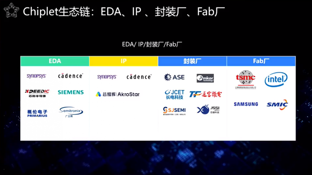 主要有四个重要角色参与Chiplet生态链:EDA供应商,IP厂商,封装厂,Fab厂。尤其对于IP供应商而言,基于IP复用的模式,设计能力较强的IP供应商有潜力演变为Chiplet供应商。而IP供应商也需要具备高端芯片的设计能力,以及多品类的IP布局和平台化的运作能力,以上都对IP供应商提出了更高的要求。又由于Chiplet加入了更多的异构芯片和各类总线,相应的EDA覆盖工作就变得更加复杂,需要更多的创新功能。国内EDA企业需要提升相关技术,应对堆叠设计带来的诸多挑战,例如对热应力、布线、散热、电池干扰等的精确仿真,在封装方面需要2.5D和3D先进封装技术支持,同时Fab方面也需要相关技术的支持。
