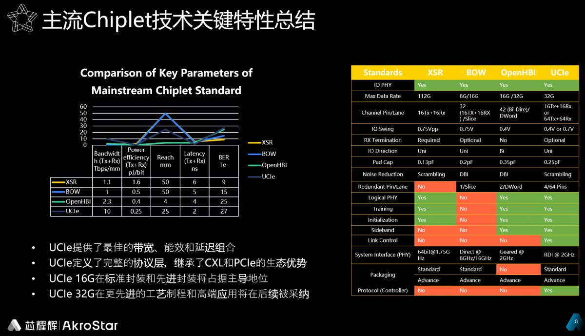 经过了几年的发展,国际上出现了一些Chiplet标准,主流标准包括XSR、BOW、OpenHBI、UCIe(详见上图右表)。右表中的绿色代表技术优势,红色代表劣势。可以看出UCIe标准在多个角度都占据优势,它定义了逻辑 PHY、训练机制、初始化序列、边带和链路控制。此外,它还重用了成熟的PCIe和CXL生态系统,这将加快这一新标准的采纳,并得到代工厂、封装厂、无晶圆厂和系统公司的支持。