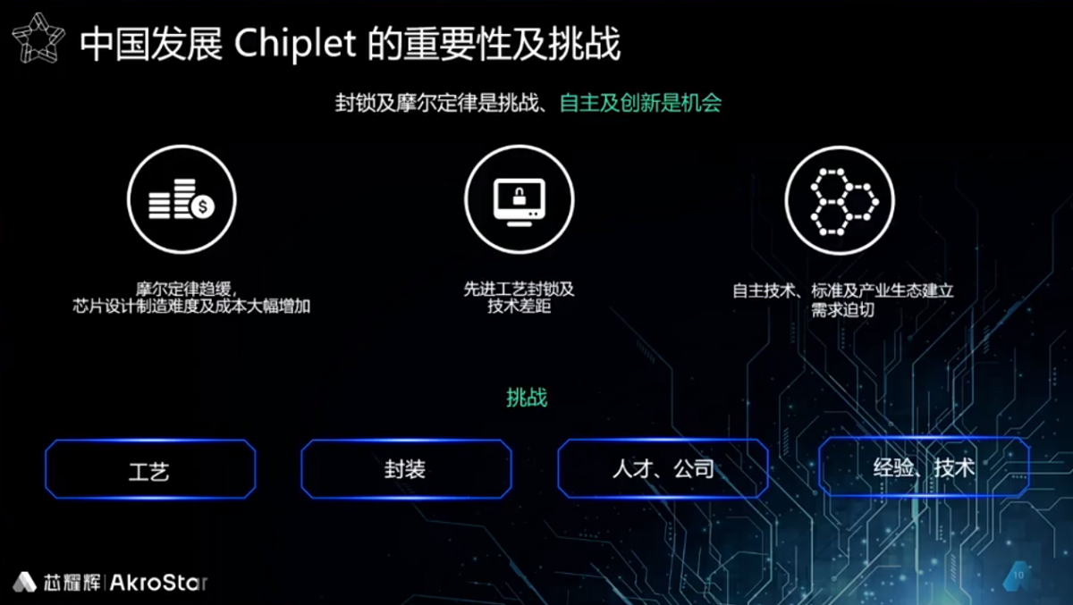 曾克强总结说:“Chiplet可提升大芯片设计良率,降低芯片研发的风险,缩短芯片的上市时间,还可增加芯片产品组合,延长产品生命周期。因此,它被视为有效延续摩尔定律的新方式。”