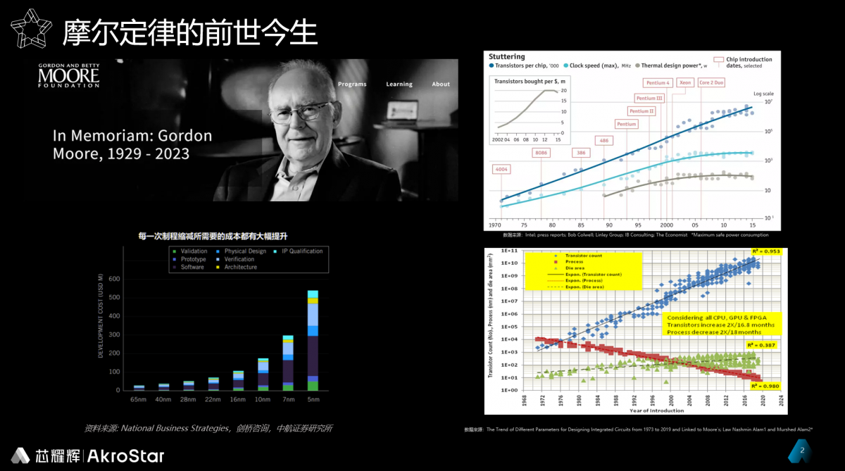 随着集成电路技术的不断演进,半导体行业发现摩尔定律在逐渐失效。上图右上部分是英特尔x86 CPU 1970-2025年的演化历史,可看出每颗芯片的晶体管数量持续增加(右上深蓝色线条),但时钟速度(右上天蓝色线条)和热设计功耗(右上灰色线条)自2005年之后就变化不大。于此同时,受先进工艺高成本支出的影响,晶体管成本降幅在2012年后趋缓,甚至越往后还有成本增加的趋势。