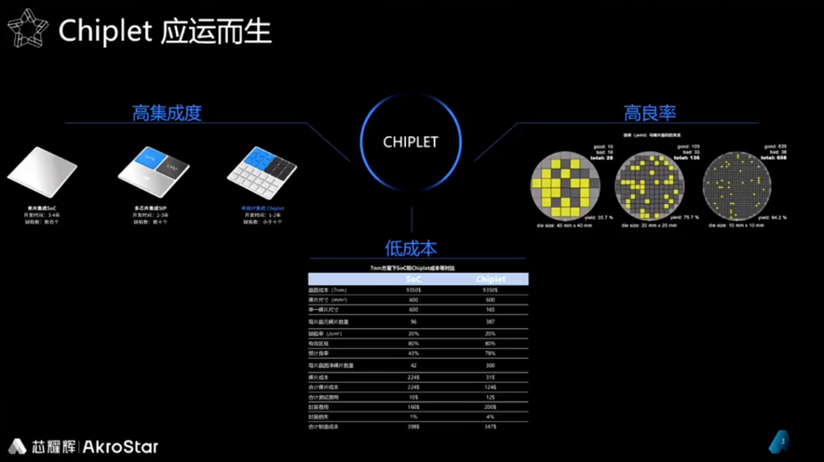 Chiplet可以提升复杂SoC芯片的良率,该方案将复杂SoC芯片分成更小的芯片。单芯片的面积越大其良率越低,它对应的芯片制造成本也就越高,芯片设计成本也会随着制程的演进而成本增长,切割小芯片可有效降低芯片设计成本。此外,在SoC设计中,模拟电路、大功率IO对制程并不敏感,不需要太高端的芯片制程,可将SoC中的功能模块,划分成单独的Chiplet,针对功能来选择合适的制程,从而让芯片实现最小化,提高芯片的良率、降低芯片成本。