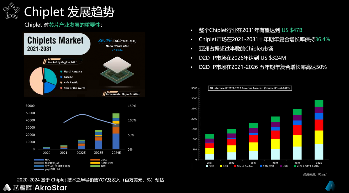 Chiplet应用在芯片中的时间还不长,但自2020年开始其发展就非常快,年复合增长率达到36.4%。预测到2031年,全球Chiplet行业市值有望达到470亿美元(上图左边)。
