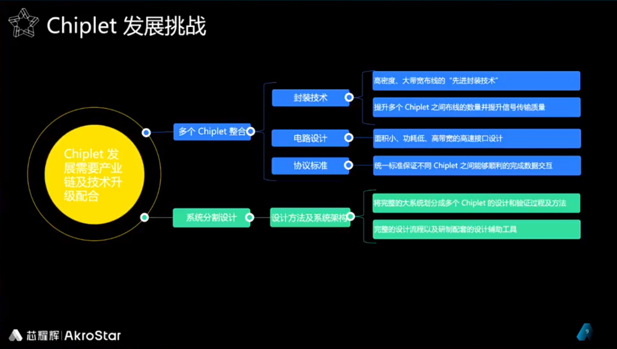Chiplet的发展刚起步不久,还面临着非常多的挑战,它需要产业链及技术升级配合。这些挑战主要分为两大类:上图蓝色部分展示的是多个Chiplet堆叠整合的挑战,绿色部分是怎么系统分割设计方面的挑战。