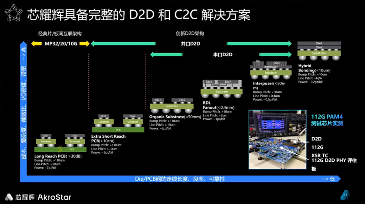 比如,芯耀辉D2D IP把互连扩展到短距离PCB,以满足中国本地市场需求。D2D IP解决方案涵盖绿色箭头所示的全部封装类型,与目前国内生产加工能力高度适配,目前112G PAM4测试芯片已经成功实测。