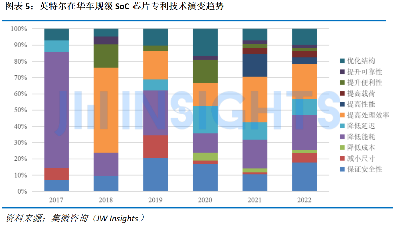 从国外企业来看,集微咨询(JW Insights)以英特尔为例,分析了英特尔在华的有效/审中专利的技术发展趋势,并指出,英特尔从2017年开始在我国的专利布局量有了较大提升。2017-2018年间,英特尔在我国布局的专利中,提高处理效率和降低能耗的专利占绝大多数。从2019年开始,英特尔在华布局的车规级SoC芯片专利涉及的技术开始愈发多样化,实现的功能也越来越丰富,提高处理效率和降低能耗的专利占比有所降低。