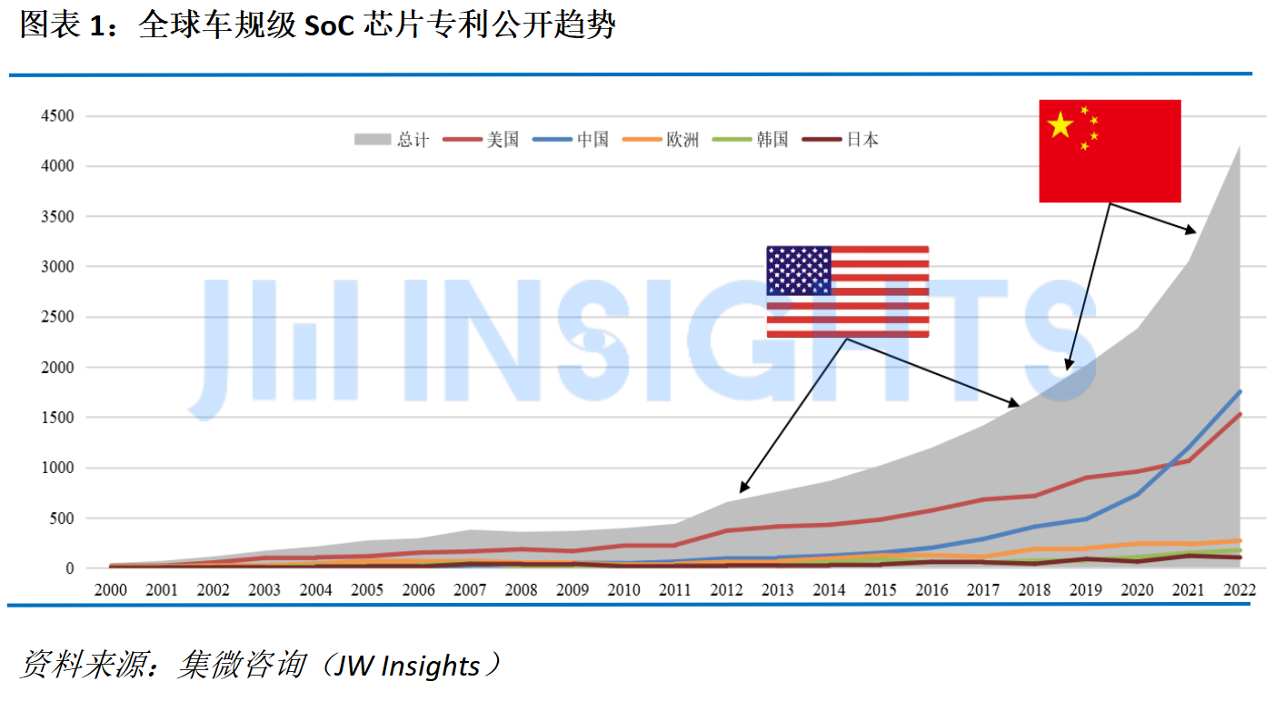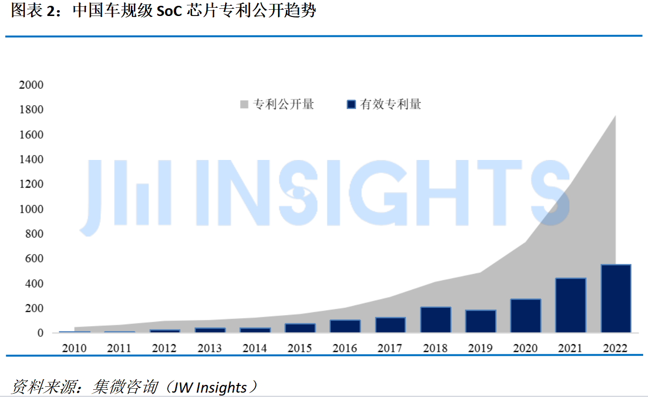 我国在车规级SoC芯片领域虽然起步较晚,但近几年抓住行业发展机遇奋起直追,集微咨询(JW Insights)指出,截至2023年2月17日,我国共有约6000件与车规级SoC芯片相关的公开专利,在全球所有国家中排名第二,仅次于美国(约10000件)。