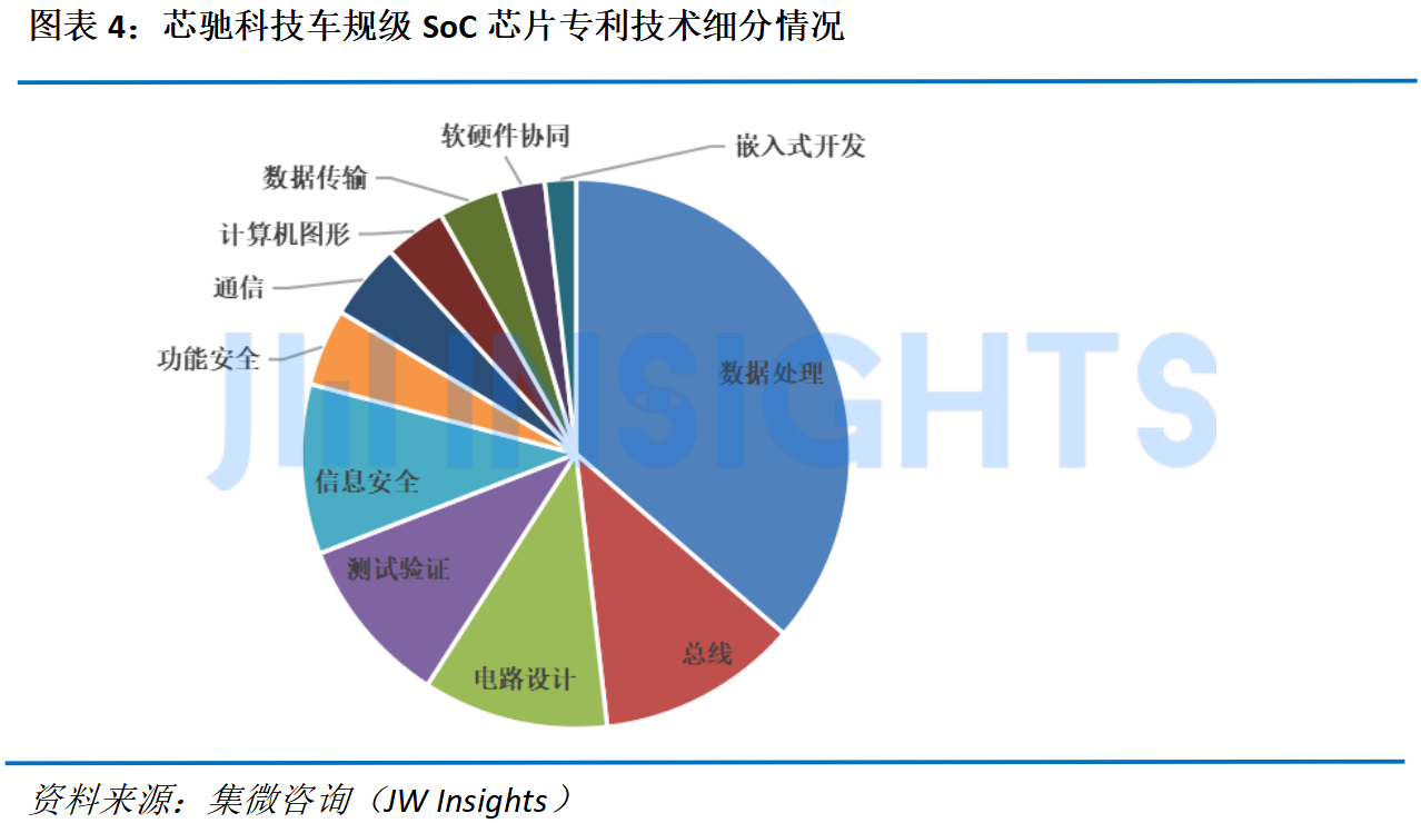 从国内企业来看,集微咨询(JW Insights)以芯驰科技为例,按公开时间截至2023年2月的数据统计,分析了芯驰科技车规级SoC芯片技术的细分情况,指出其主要专利技术点聚焦在数据处理上,在总线技术、电路设计、信息安全和测试验证等技术也公开了一定数量的专利;功能安全、通信、计算及图形、数据传输、软硬件协同、嵌入式开发等技术公开的专利相对较少。总体来说,芯驰科技在车规级SoC芯片技术上的专利布局相对较全面。