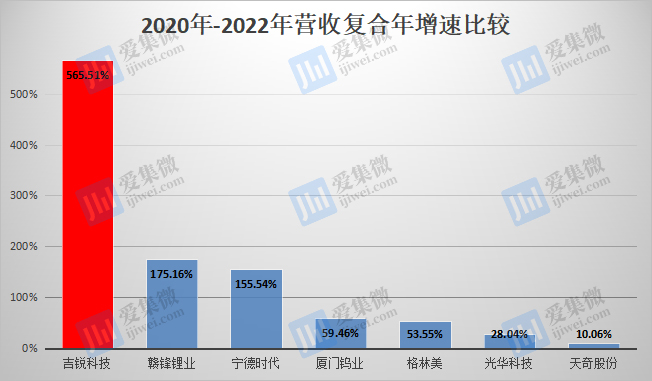 成立次年即实现营收2099.32万元,伴随2021年、2022年新能源汽车产业超预期发展,国内出现了较为严重的锂资源短缺行情,在行业推动下,吉锐科技碳酸锂等产品量价齐升,至2022年,其营收规模已达9.3亿元,2020年-2022年(下称“报告期”)营收复合年增速高达565.51%,大幅领先于厦门钨业、宁德时代、光华科技、赣锋锂业、格林美、天奇股份等可比公司。