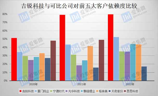 吉锐科技同时面临业绩高度依赖前五大客户的风险。IPO招股书显示,报告期内,吉锐科技前五大客户贡献的营收比重分别为51.29%、79.05%、79.65%,呈持续增长趋势,且报告期各期比重均高于一众可比公司。结合其前五大客户频繁变动现状,一旦新客户开拓不利,吉锐科技业绩将存在剧烈波动的风险。