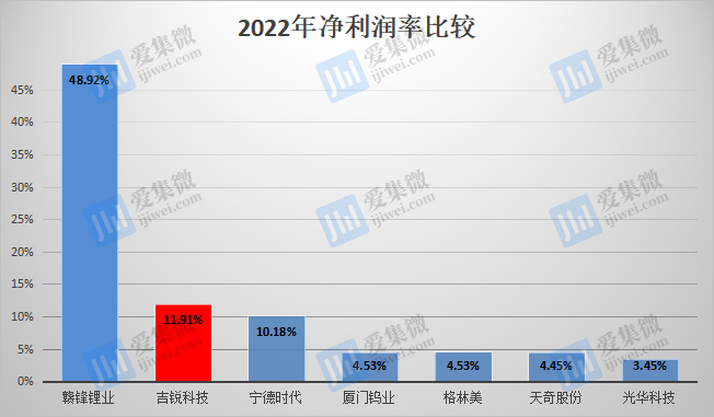 在营收快速增长带动下,吉锐科技成立第三年就实现扭亏为盈,并于2022年实现净利润1.11亿元,从规模上看,虽然较宁德时代、赣锋锂业、厦门钨业、格林美等公司还有较大差距,但已能直追光华科技、天奇股份等可比公司。而且,吉锐科技2022年净利润率为11.91%,仅次于赣锋锂业的48.92%,高于其他一众可比公司。