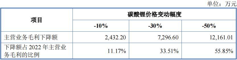 为此,吉锐科技还以2022年为基准,碳酸锂销售价格及对应的原材料成本同时下降10%、30%、50%时,对公司主营业务毛利的影响将分别下降11.17%、33.51%、55.85%,具体见下表: