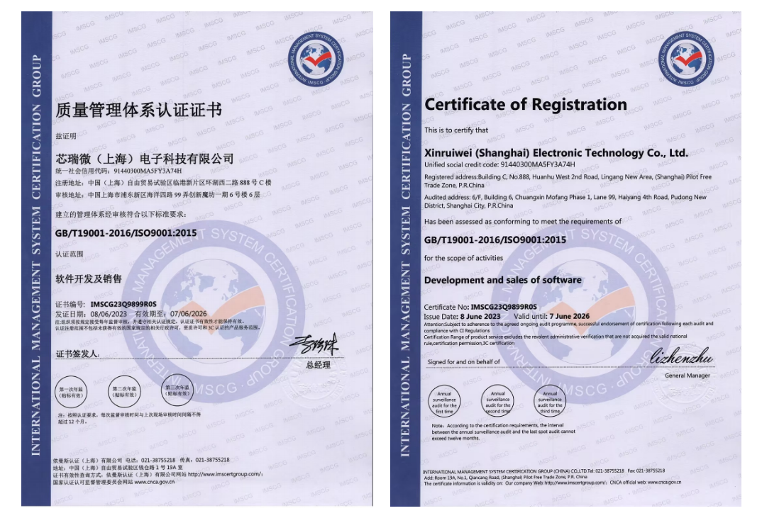 芯瑞微国内自主研发的软件产品收到双证认证!
