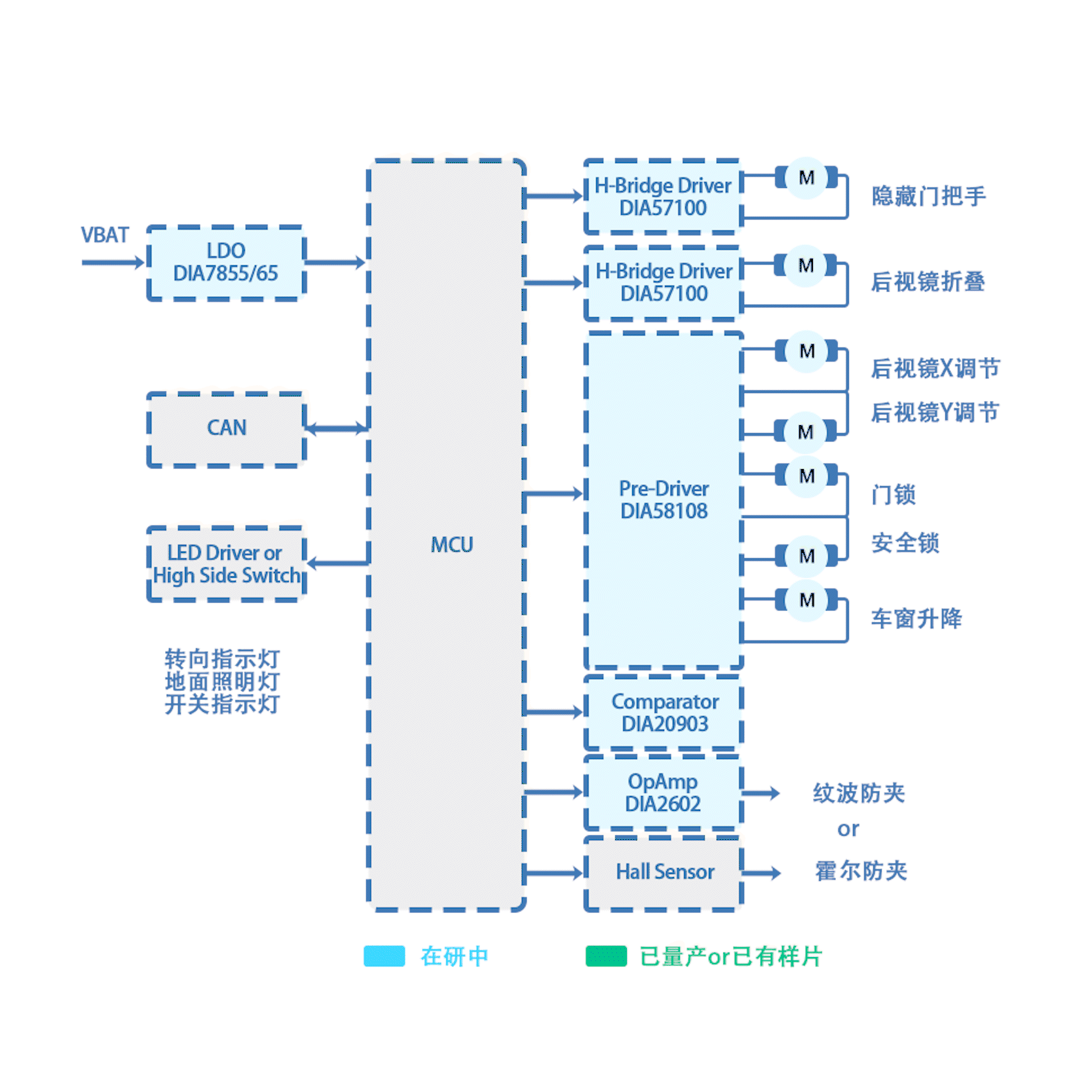 针对车身控制应用,帝奥微能够提供全系列的解决方案,包括马达驱动、电源、运放、电流检测、比较器等产品。