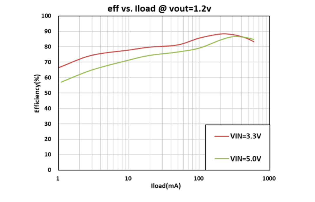 当输入电压为3.3V,输出电压为1.2V时,DIO62820最高转换效率接近90%。