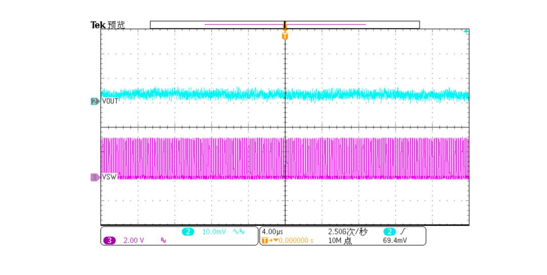 当输入电压为3.3V,输出电压为0.9V,带载0.6A时,纹波很小。