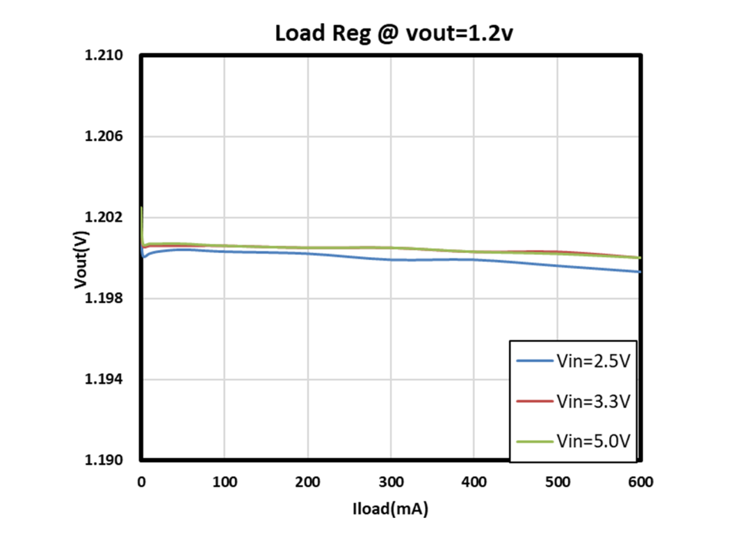 常温下,输出电流0~600mA范围内,输出电压1.2V,其波动范围约为±2mV。