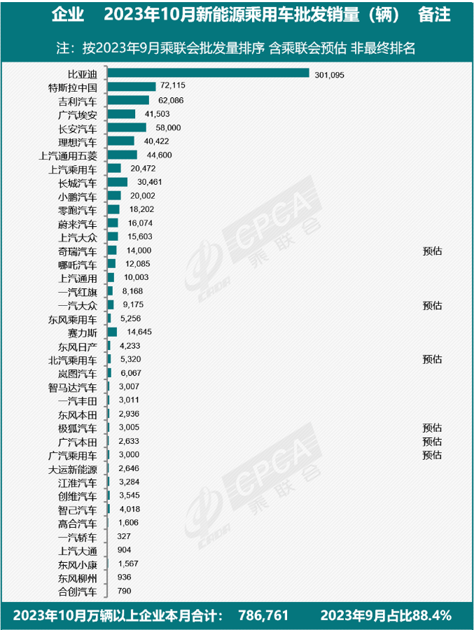 10月销量破万的企业数量达到17家,除前述6家外,还有上汽通用五菱、上汽乘用车、长城汽车、小鹏汽车、零跑汽车、蔚来汽车、上汽大众、奇瑞汽车、哪吒汽车、上汽通用、赛力斯,17家企业合计新能源汽车销量达786761辆。
