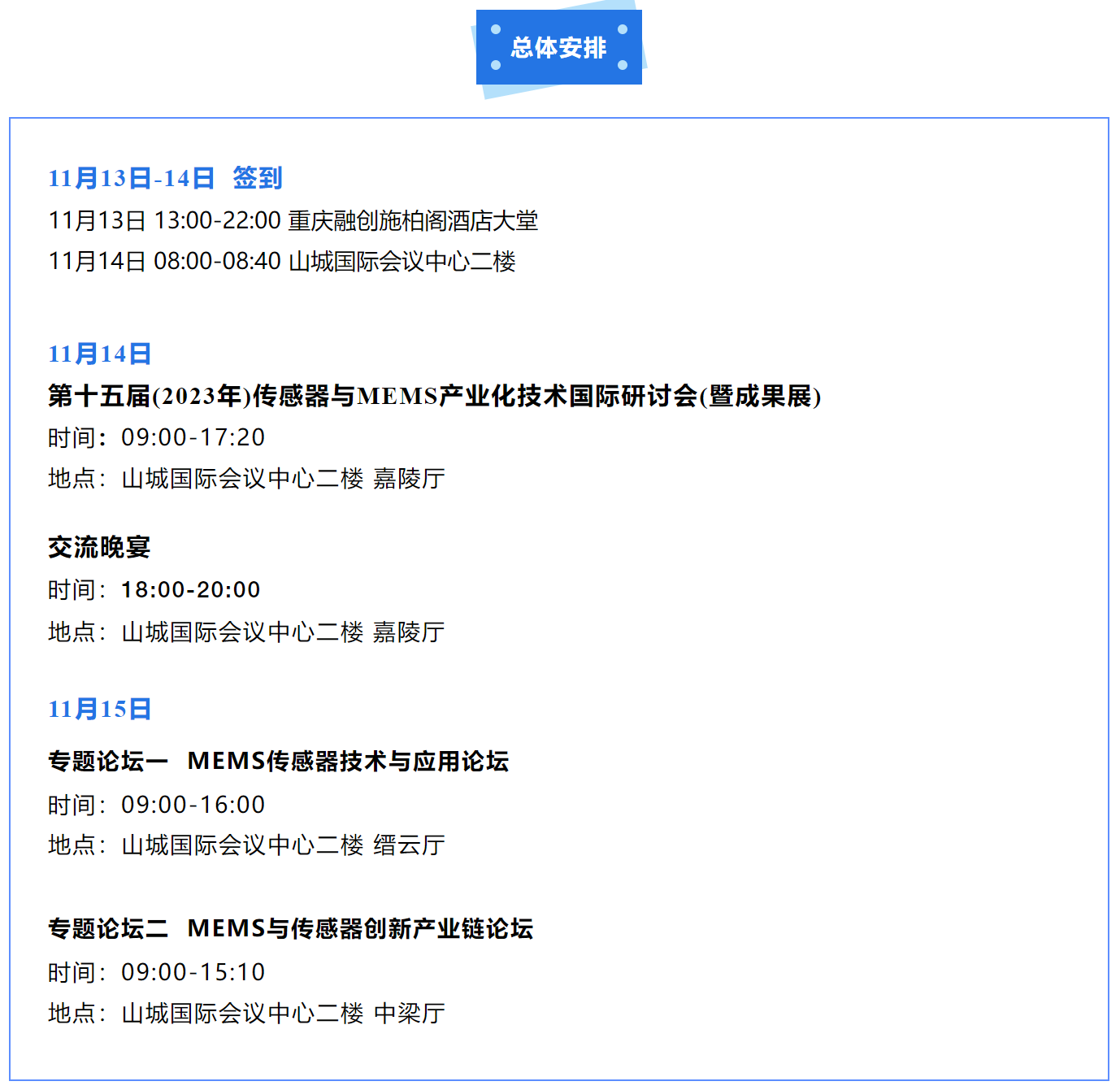 第十五届(2023年)传感器与MEMS产业化技术国际研讨会(暨成果展) 将于2023年11月13-15日在重庆开幕。大会邀请四十多位来自海内外的知名专家以及企业精英,共同探讨业内前沿技术、行业现状及发展机遇。这必将是MEMS行业的一场盛宴!