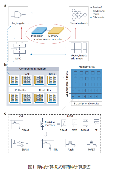 近年来,面向人工智能等数据密集型应用,为了突破芯片算力瓶颈,后摩尔时代新器件和计算架构成为芯片发展的研究重点。其中,存内计算作为一种新型计算技术,得到学术界、工业界的广泛关注与大量研究投入。相关研究方向包含从基础电子器件到高层级架构、大规模系统等各个层级,从成熟硅基存储器到新兴阻变存储器等各类元器件。尽管名称相同,不同类型存内计算技术的基本原理存在很大不同,具体取决于:1、输入操作数是否由存储单元原位提供;2、计算输出是否原位回存至存储单元;3、输入/输出数据是易失性的还是非易失性的;4、输入/输出数据是否以相同的物理变量表示。这些差异使得人们很难对不同存内计算技术形成包容性的全面了解,也阻碍了学术界和工业界不同领域(如半导体器件、IC设计、计算机体系结构等)之间的理解与沟通。