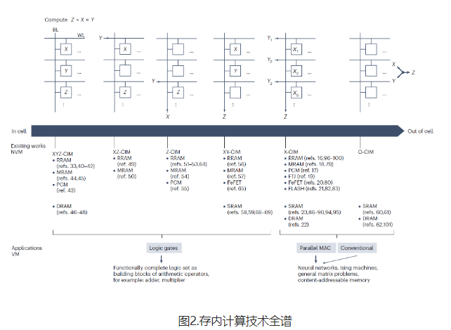存内计算用于克服传统计算架构中的冯·诺依曼瓶颈,为提高芯片算力与计算能效提供一个可持续性的解决方案。不同存内计算技术的基础是利用硬件实现两种计算原语:逻辑门和乘累加运算(图1)。观察任一原语中的输入和输出,存内计算技术在存储单元如何参与计算过程方面有所不同。论文通过鉴别存储单元作为输入和/或输出参与计算的程度,提供了所有存内计算技术的全谱分类(图2)。这一分类方式对于所有存储器类型都成立,包括成熟的或新兴的、易失性或非易失性的、电阻性的或电容性的存储技术。论文阐明了全谱范围内标准存内计算技术的详细原理,为不同技术的优劣衡量、改进方向提供一个统一的视图,将有力支持存内计算技术的长期发展与实际应用。该分类法还可以通过将全谱应用于不同的存储器件和计算原语来开发其它新型存内计算技术。审稿人认为,该论文将为存内计算领域的研究人员提供指导。