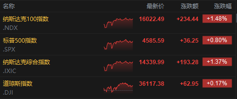美股三大指数集体上涨。其中,标普收涨0.8%,报4585.59点;纳指收涨1.37%,报14339.99点;道指收涨62.95点,涨幅0.17%,报36117.38点。