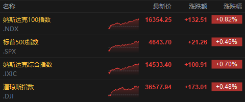 美股三大指数集体上涨。其中,纳指收涨0.7%,报14533.40点;标普收涨0.46%,报4643.7点;道指收涨173.01点,涨幅0.48%,报36577.94点。