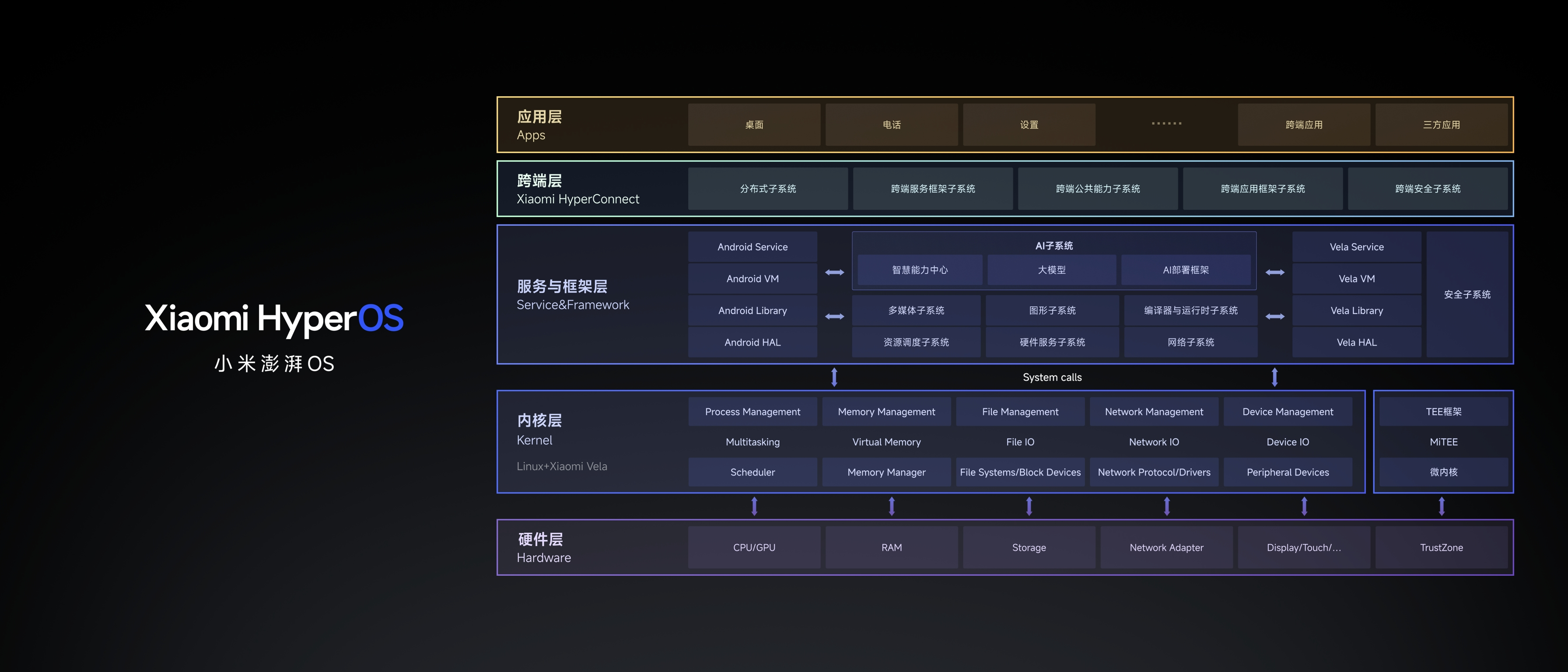 小米澎湃OS的底层核心系统,由Linux和自研Xiaomi Vela融合而成,极佳的异构兼容性和精准强悍的系统资源管理能力,让每一台设备都能发挥最佳性能。小米澎湃OS底层支持200余个处理器平台,20余种常见文件系统,覆盖数百种设备品类、数千SKU,可依据硬件灵活配置、灵活运行、弹性部署——兼容的设备RAM大小,小至64KB,大至24GB。基于不同硬件仅配置必需资源的原则,配合底层IO技术栈的文件去重和压缩,小米澎湃OS天生轻巧:在手机端,小米澎湃OS的系统固件占用可低至8.75GB,远远低于竞品。