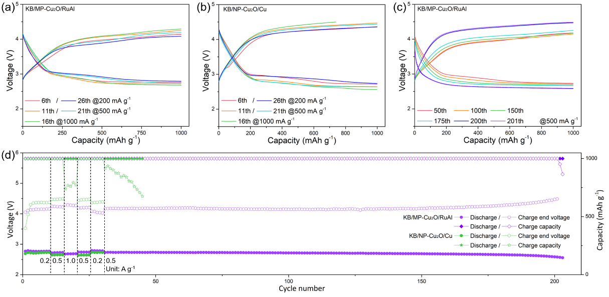 图6 不同电流密度下获得的(a) KB/MP-Cu2O/RuAl电极和(b) KB/NP-Cu2O/Cu电极的GDC曲线,以及(d)充放电终止电压和容量演化曲线。(c) 电流密度为500 mA·g-1时,KB/MP-Cu2O/RuAl的GDC曲线