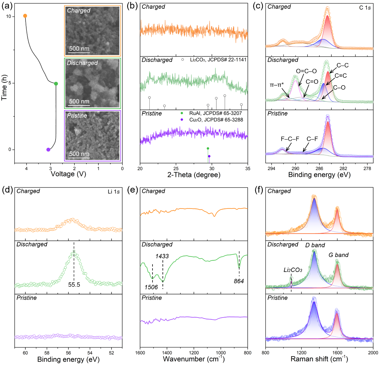 图5 以KB/MP-Cu2O/RuAl为正极构筑的Li−CO2电池反应机制。(a)首次充放电曲线和SEM图;(b) XRD衍射花样;(c) C1s和(d) Li 1s XPS谱图;(e) FTIR谱图;(f) Raman谱图