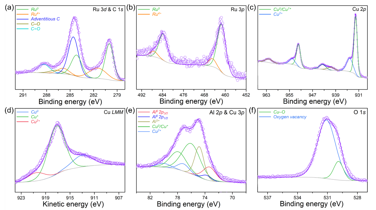 图4 MP-Cu2O/RuAl的XPS谱图:(a) Ru 3d & C 1s;(b) Ru 3p;(C) Cu 2p;(d) Cu LMM;(e) Al 2p & Cu 3p;(f) O 1s