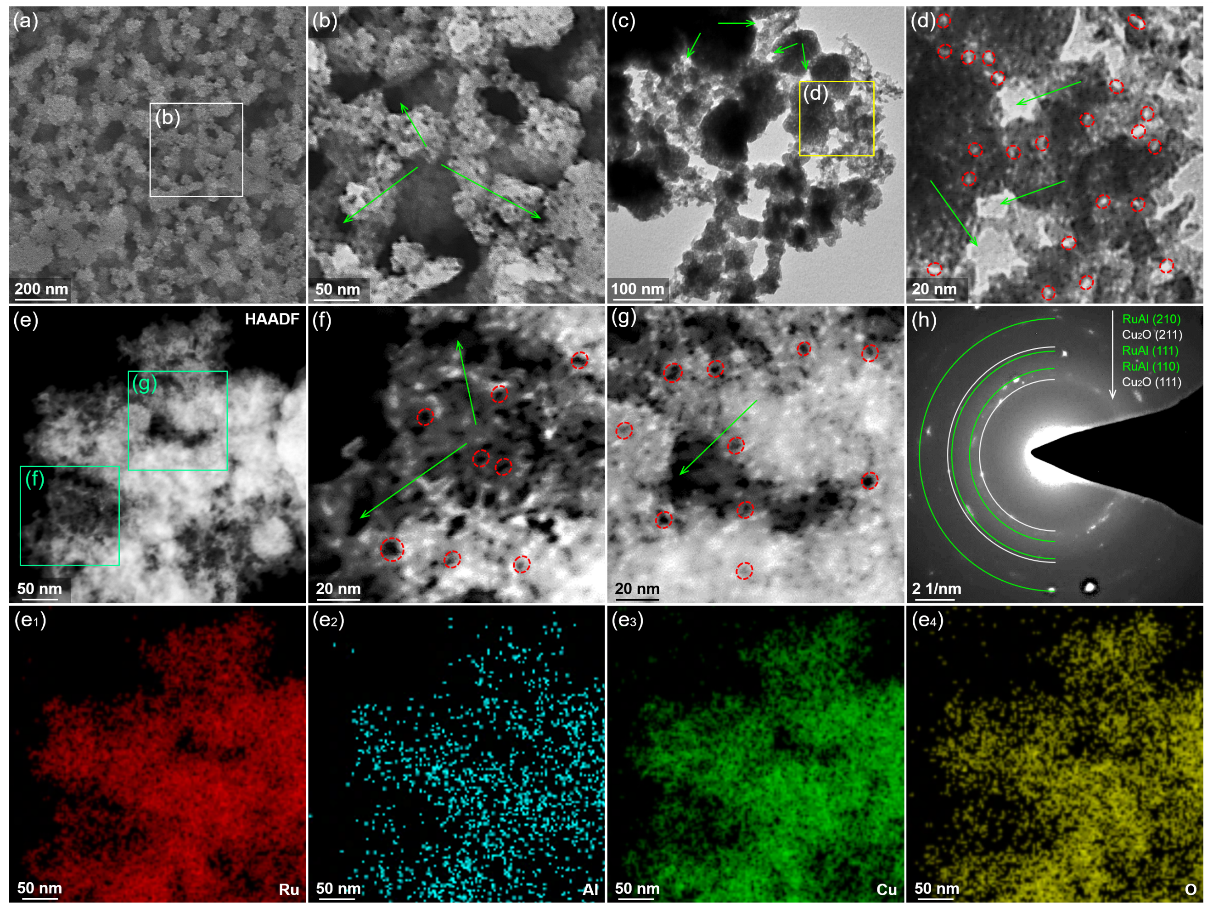 图2 MP-Cu2O/RuAl的(a, b) SEM;(c, d) TEM;(e−g) HAADF-STEM图;(h)SAED。(e1−e4)为对应于(e)的EDS元素分布图