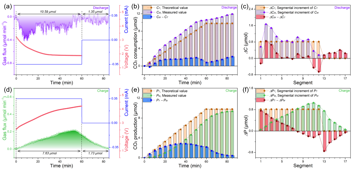 原位DEMS显示,CO2实测消耗量(CM)最初几段(每5分钟为一段)的增量(∆CM)均高于理论值(∆CT= 0.816 μmol),这应源于KB/MP-Cu2O/RuAl对CO2的吸附 (图8a−c)。在随后的50 min内,∆CM −∆CT逐渐下降至~0 μmol,并略有波动,这一结果表明,CO2气体已经建立了吸附−消耗−解吸动态平衡。整个放电过程的CM为~10.59 μmol,比理论消耗量(CT = 9.79 μmol)高出~0.80 μmol,可归因于KB/MP-Cu2O/RuAl电极的吸附。电池充电时,PM在最初35 min内的各段增量值(∆PM)均明显低于理论值(∆PT = 0.816 μmol),但在随后的25 min内均高于∆PT。电池充电过程(前60min)的PM为~7.63 μmol,明显低于理论值(PT = 9.79 μmol)。值得注意的是,充电终止后,仍可检测到CO2析出信号(持续约25min)。充电过程中CO2析出总量为PM = ~9.36 μmol,其与转移电子数之比为~0.717,接近理论值3CO2/4e-。上述结果表明,MP-Cu2O/RuAl可有效催化Li−CO2电池可逆反应。