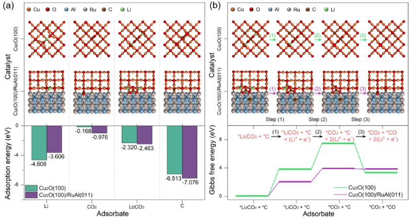 Cu2O(100)/RuAl(011)异质结和Cu2O(100)均表现出适度Li吸附,表明它们均可在CO2还原反应中获取Li (图7a)。得益于RuAl金属间化合物和异质界面的构筑,Cu2O(100)/RuAl(011)表现出显著优于Cu2O(100)的CO2吸附能,有利于CO2的捕获与活化,从而提升CO2电化学还原反应动力学。此外,Cu2O(100)/RuAl(011)对Li2CO3和C都具有较高的吸附能,可有效地引导放电产物均匀沉积 (图7b)。Li2CO3中Li−O键具有较高结合能,与Li+解离相关的中间步骤也因此被认为是CO2ER的决速步。Cu2O(100)与RuAl(011)复合形成丰富的异质界面,增加了活性位点密度;驱动电子在Cu2O(100)/RuAl(011)异质结中的再分布,提升了催化位点活性,获得了较高Li2CO3与C可逆共分解反应催化活性。