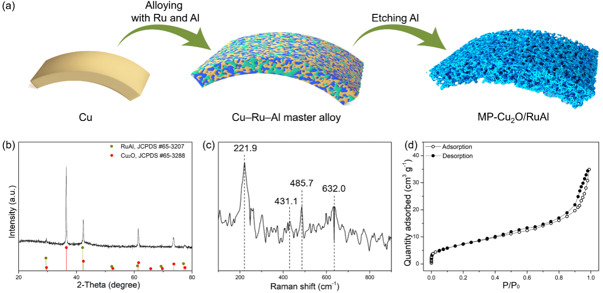 图1 (a) MP-Cu2O/RuAl的制备示意图;(b) XRD衍射花样;(c) Raman谱图;(d)氮气吸脱附等温线