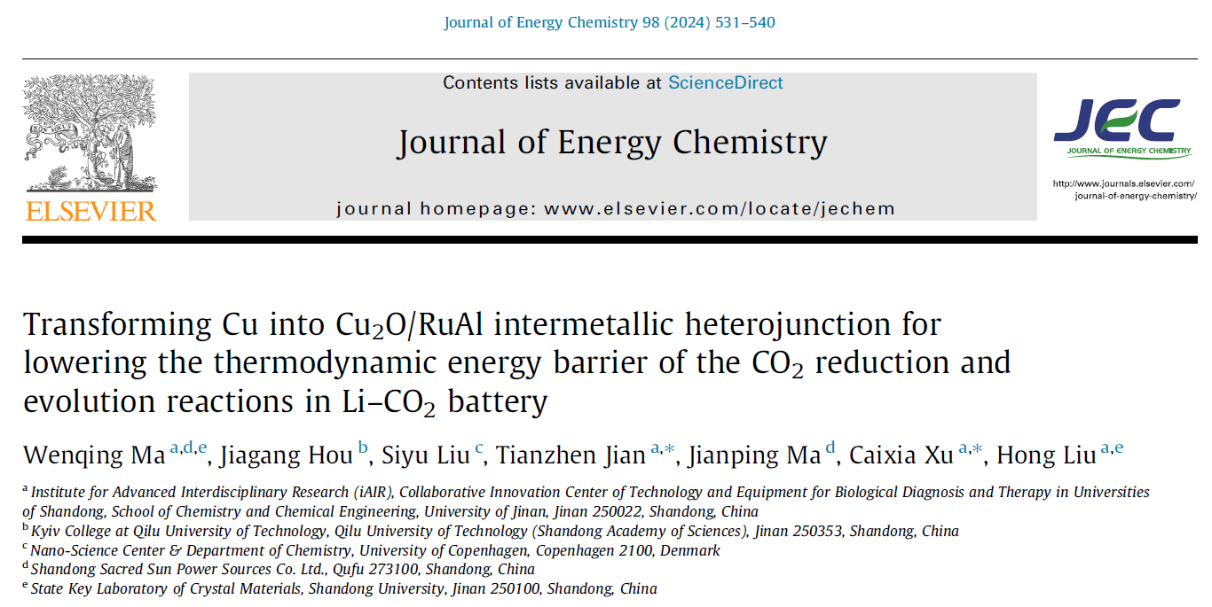 1. Transforming Cu into Cu2O/RuAl intermetallic heterojunction for lowering the thermodynamic energy barrier of the CO2reduction and evolution reactions in Li–CO2 battery. J. Energy Chem., 2024, 98, 531–540.
