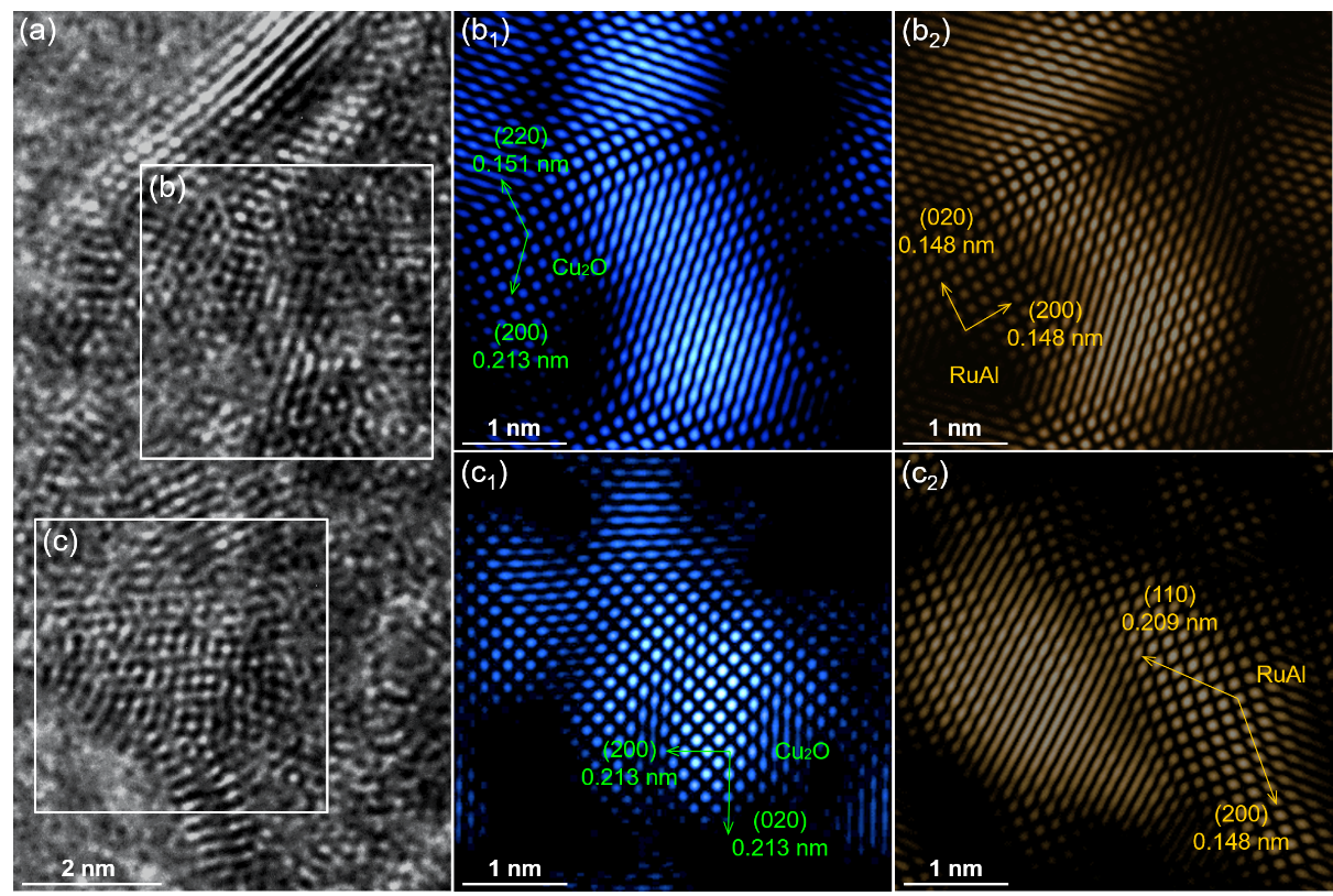 图3 (a) MP-Cu2O/RuAl的HRTEM图。(b1, b2)和(c1, c2)分别为对应于(a)中(b)选区和(c)选区的IFFT图