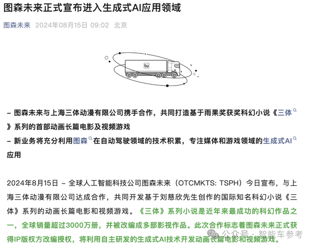 因此,根据公司章程和治理制度,图森集团于2024年8月12日召开董事会,正式批准了建立生成式AI新业务方向,正式进入动漫电影和游戏行业。8月15日,公司正式宣布与三体宇宙的相关IP授权与合作。