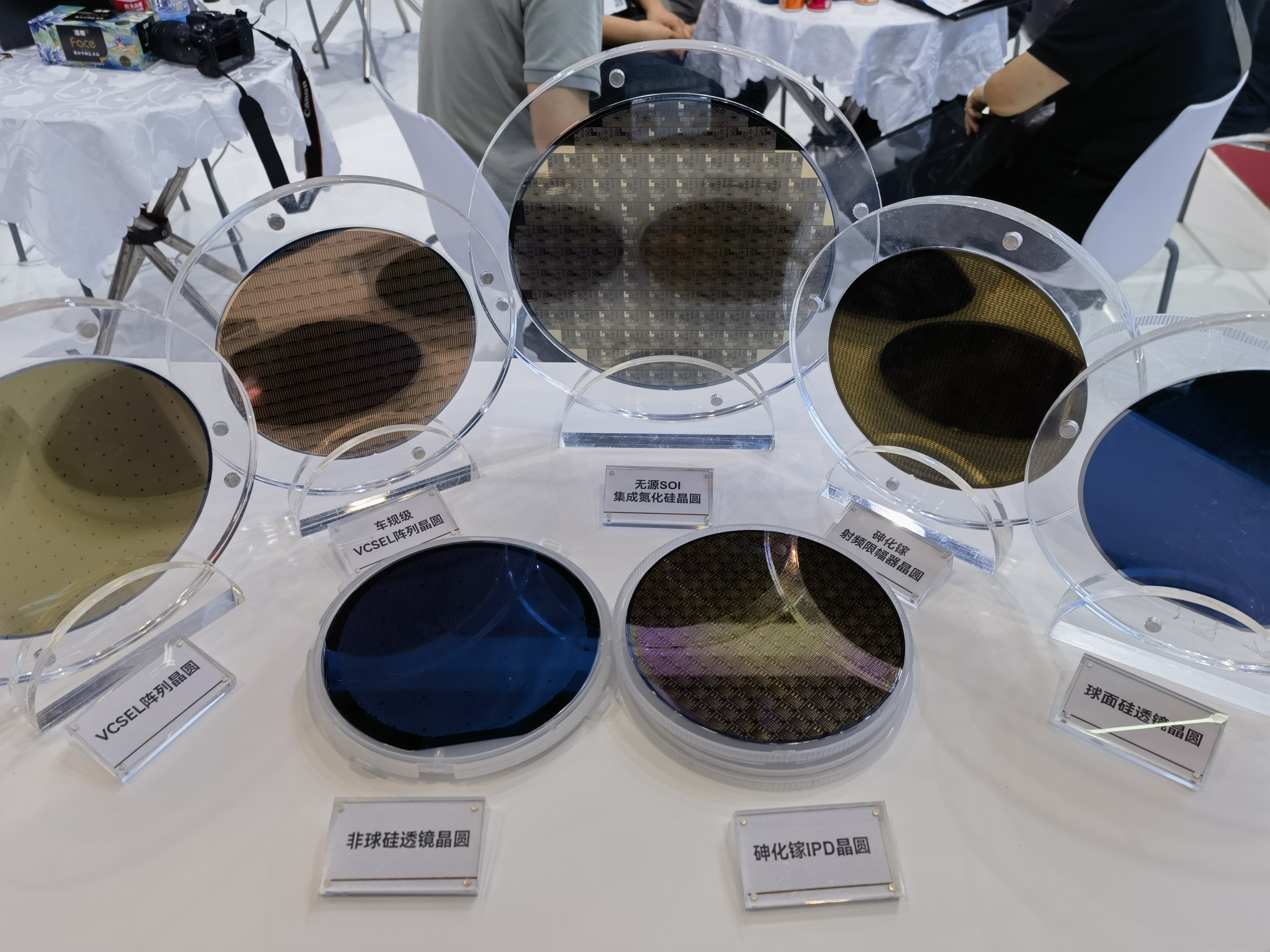 在展会上,陕西光电子先导院科技有限公司(简称“光电子先导院”)携六吋车规级VCSEL阵列晶圆 、六吋球面硅透镜晶圆,六吋非球硅透镜晶圆、八吋无源SOI集成氮化硅晶圆等7款最新成果亮相,重点展示化合物平台和硅光平台的技术突破与创新成果,吸引了诸多参观者的目光,行业人士共聚展台交流探讨。