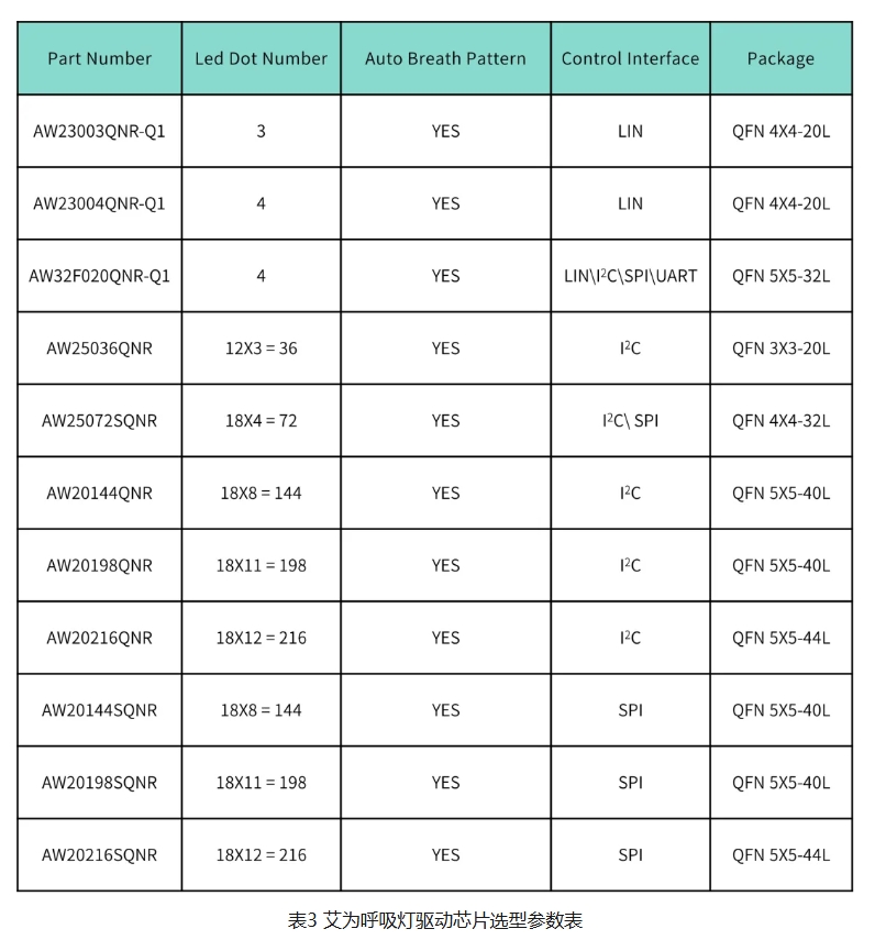 艾为拥有丰富的呼吸灯驱动芯片家族,在不同LED路数配置下均能保持强大的降噪性能,全面覆盖多样化场景的设计需求。如需了解其他型号的详细参数、适配场景,欢迎参考下方的产品选型表: