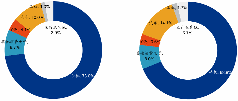 2019年(左)、2024年(右)CMOS图像传感器市场下游应用格局(按销售额,数据来源:格科微、Frost&Sullivan)