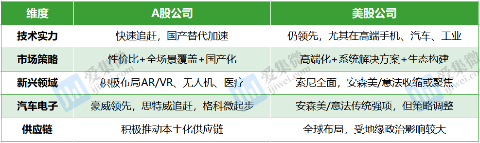 供应链与模式方面,A股公司积极推动供应链本土化以保障产能安全;格科微创新性地采用“Fab-Lite”模式,自建部分产线以提升工艺协同能力和竞争力。美股公司则依托全球化布局,但当前地缘政治因素为其带来不确定性。
