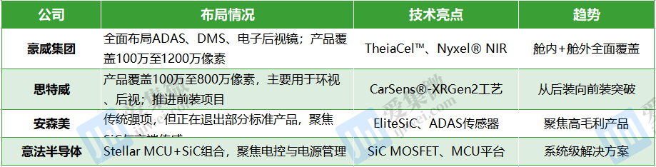 美股公司中,安森美是传统汽车CIS巨头,但正在进行战略调整,逐渐退出部分标准产品——市场体量最大的环视市场,更专注于碳化硅(SiC)和高端ADAS传感器。汽车业务是意法半导体核心,但更侧重于汽车MCU、碳化硅功率器件和智能电源管理,与CIS形成系统级组合。