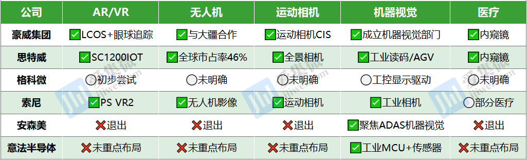 美股公司中,索尼在AR/VR(PS VR2)、无人机、运动相机等领域均有布局,但安森美和意法半导体对此领域涉猎较少或正在收缩。
