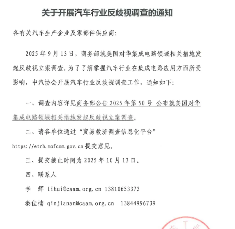 此次调查源于9月13日商务部发布的2025年第50号公告,决定就美国对华集成电路领域相关措施发起反歧视立案调查。作为行业代表组织,中汽协会迅速响应,联合相关主管部门,面向整车企业及零部件供应商展开系统性信息收集工作。
