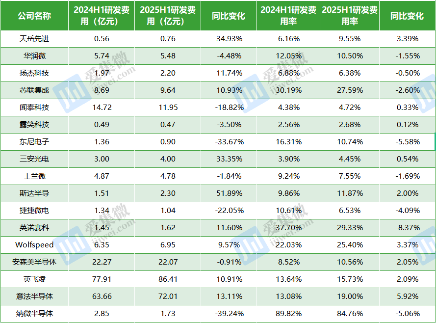 美股企业研发投入呈现分化:英飞凌(864127.0万元,+10.9%)、意法半导体(720078.8万元,+13.1%)加大SiC与工业芯片研发,投入同比增长;Wolfspeed(69549.9万元,+9.6%)虽投入增长,但因营收下滑,费用率提升3.4个百分点至25.4%;安森美半导体(-0.9%)、纳微半导体(-39.1%)则因盈利压力缩减研发投入。尽管美股龙头研发投入绝对值仍领先,但A股+港股企业研发费用率已接近或超过美股企业,且投入增速更快,长期有望缩小技术差距。