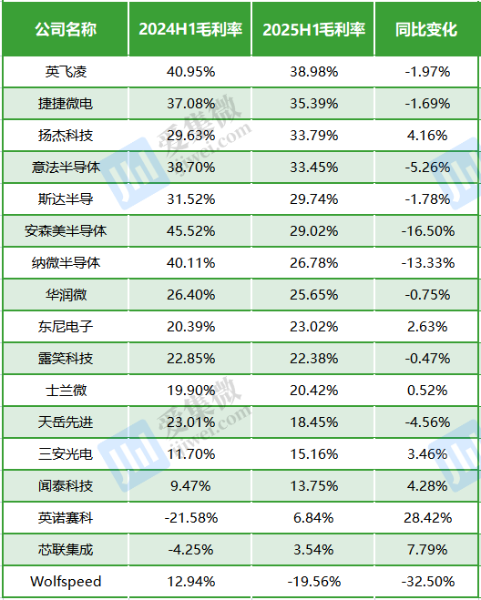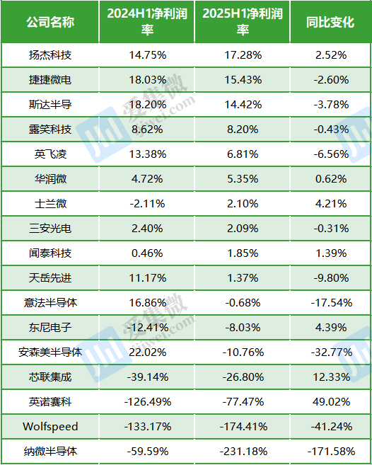 美股市场则呈现“龙头承压、中小亏损”的格局。英飞凌(39.0%)、意法半导体(33.4%)作为传统功率半导体龙头,毛利率同比分别下降1.97、5.3个百分点,核心原因是汽车电子客户库存调整与SiC价格竞争加剧;安森美半导体受产能利用率不足影响,毛利率从2024年的45.5%大幅降至29.0%,盈利能力显著弱化。中小厂商更陷入困境,Wolfspeed因SiC衬底价格下行与工厂关闭,毛利率由2024年的12.9%转为-19.6%;纳微半导体受中国EV市场疲软拖累,毛利率同比下降13.3个百分点至26.8%,且计提SiC库存减值进一步侵蚀利润。